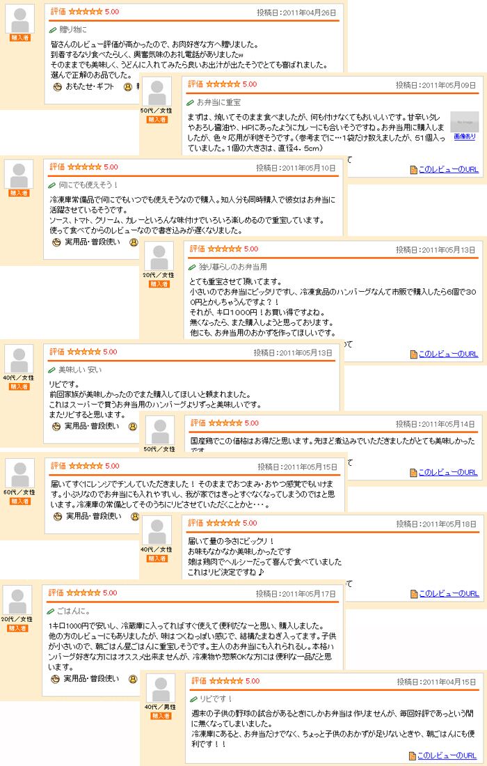 鶏肉(国産)、玉葱、粒状大豆たん白、つなぎ(パン粉、小麦粉、粉末状大豆たん白)、豚油、食塩、砂糖、醤油、調味料(アミノ酸)、リン酸塩、カラメル色素、揚げ油(大豆油)、(主原料の一部に乳製分を含む)