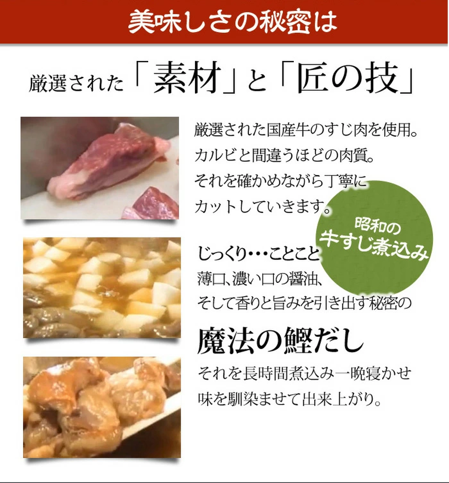 牛すじ肉、こんにゃく、だいこん、みりん、醤油(薄口、濃い口)、砂糖、鰹だし
