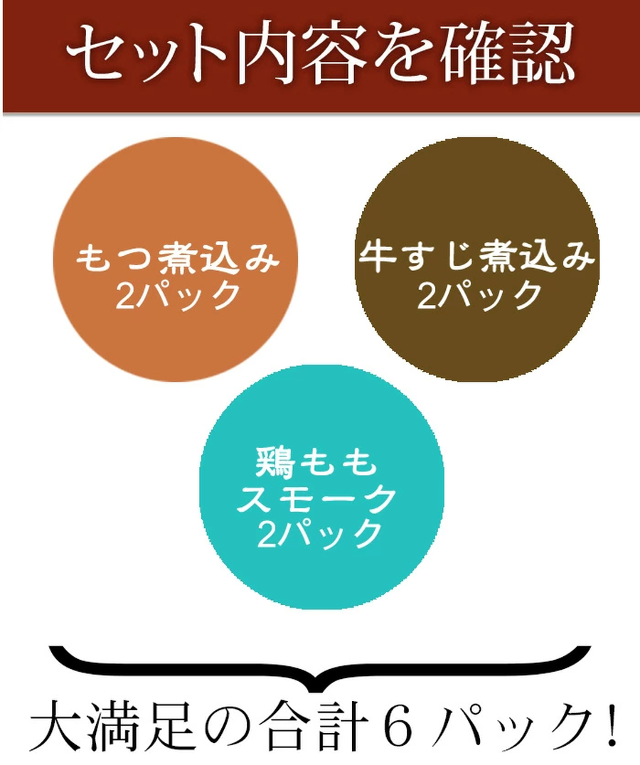 豚もつ煮込み(1パック200g)、牛すじ煮込み(1パック150g)、鶏ももスモーク(1パック)