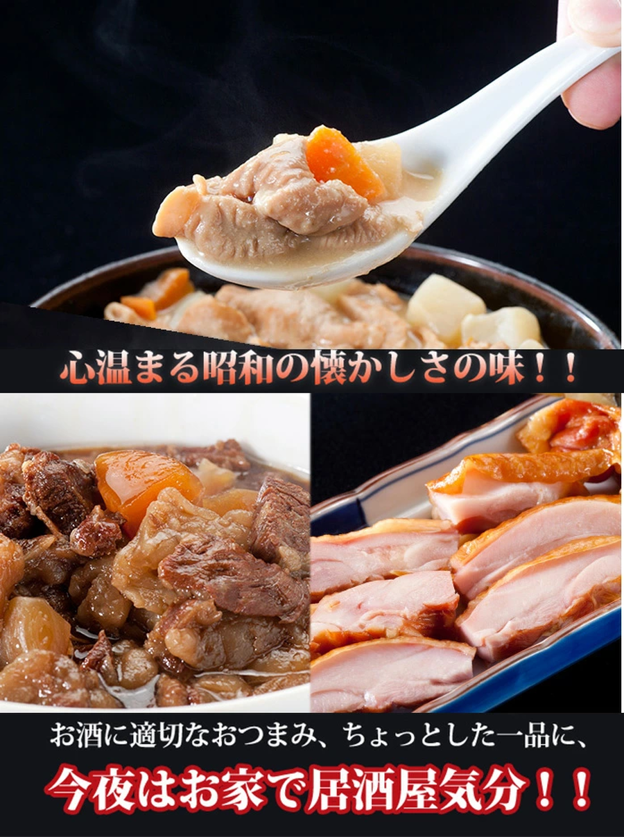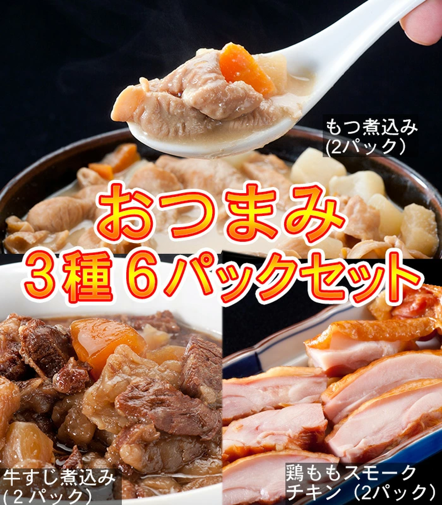 【送料無料】牛すじ煮込み(2P) もつ煮込み(2P) 鶏ももスモークチキン(2P)昔懐かしのお酒のおつまみお惣菜6パックセット【牛スジ 牛筋】【訳あり】【湯せん】
