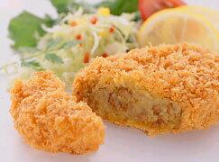 野菜(ばれいしょ(北海道、遺伝子組換えでない)、たまねぎ)、パン粉、砂糖、粒状大豆たん白、牛脂、クリーミングパウダー(デキストリン、植物油脂、脱脂粉乳、その他)、食塩、植物油脂、牛肉(オーストラリア)、香辛料、衣(パン粉、小麦粉、植物油脂)/着色料(カラメル、アナトー)、調味料(アミノ酸)、(一部に小麦・乳成分・大豆・牛肉を含む)